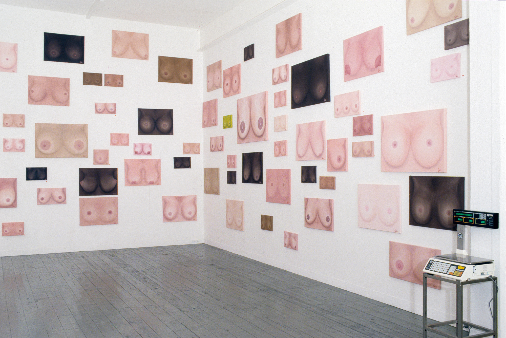 Maria Kozic, 'This Is The Show T.I.T.S.', 1991. Installation acrylic on canvas, electronic weight scales, ladder, breasts