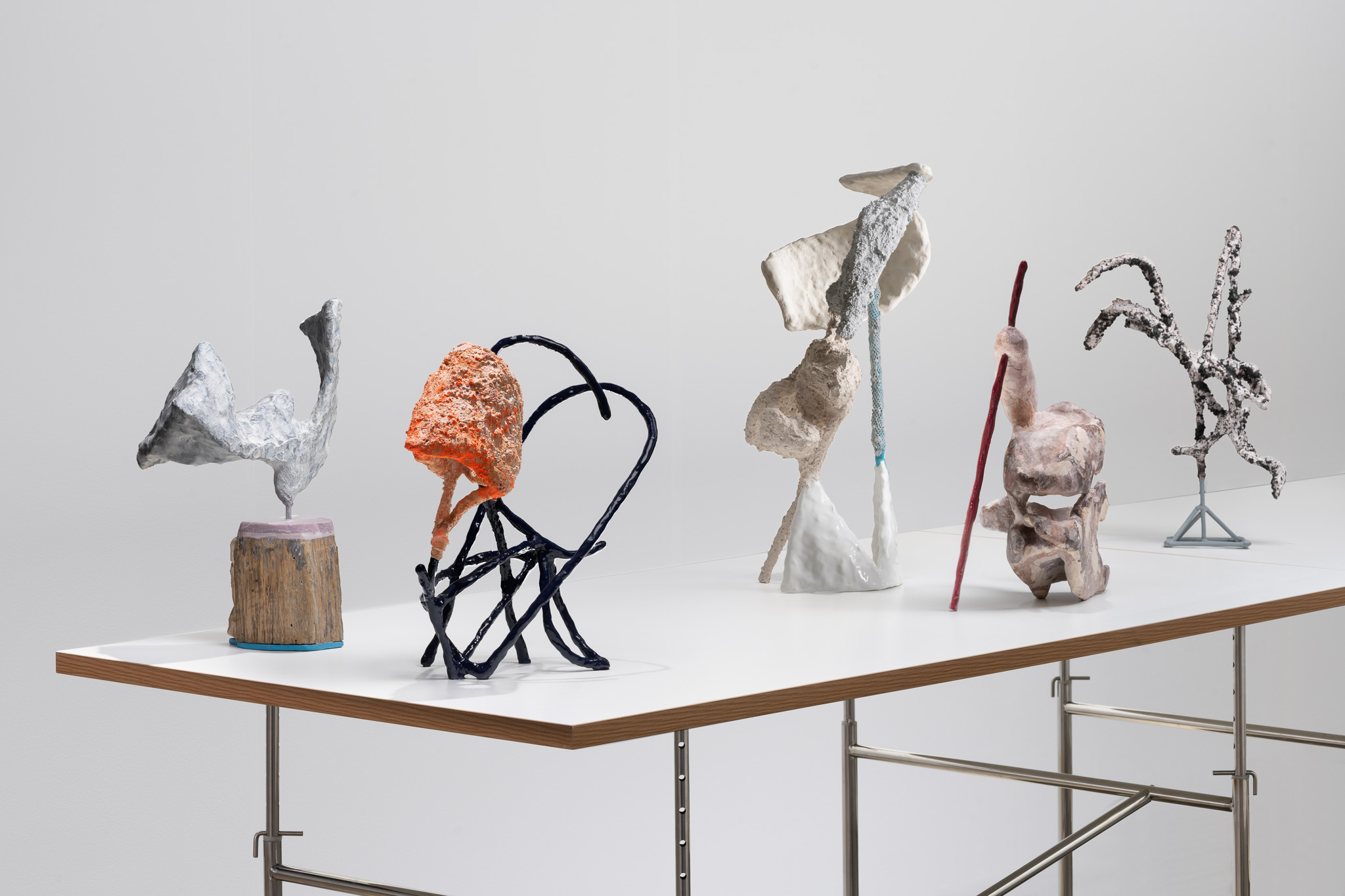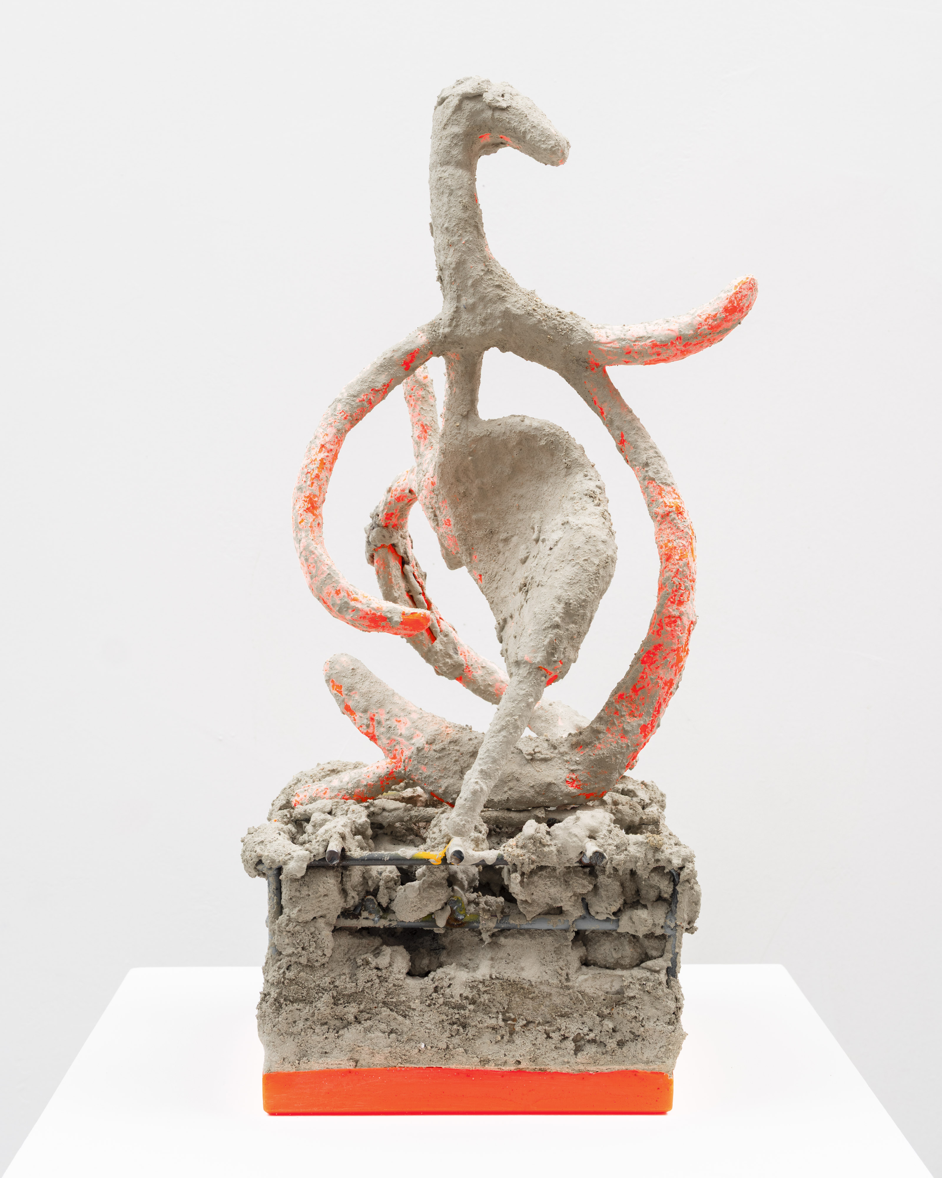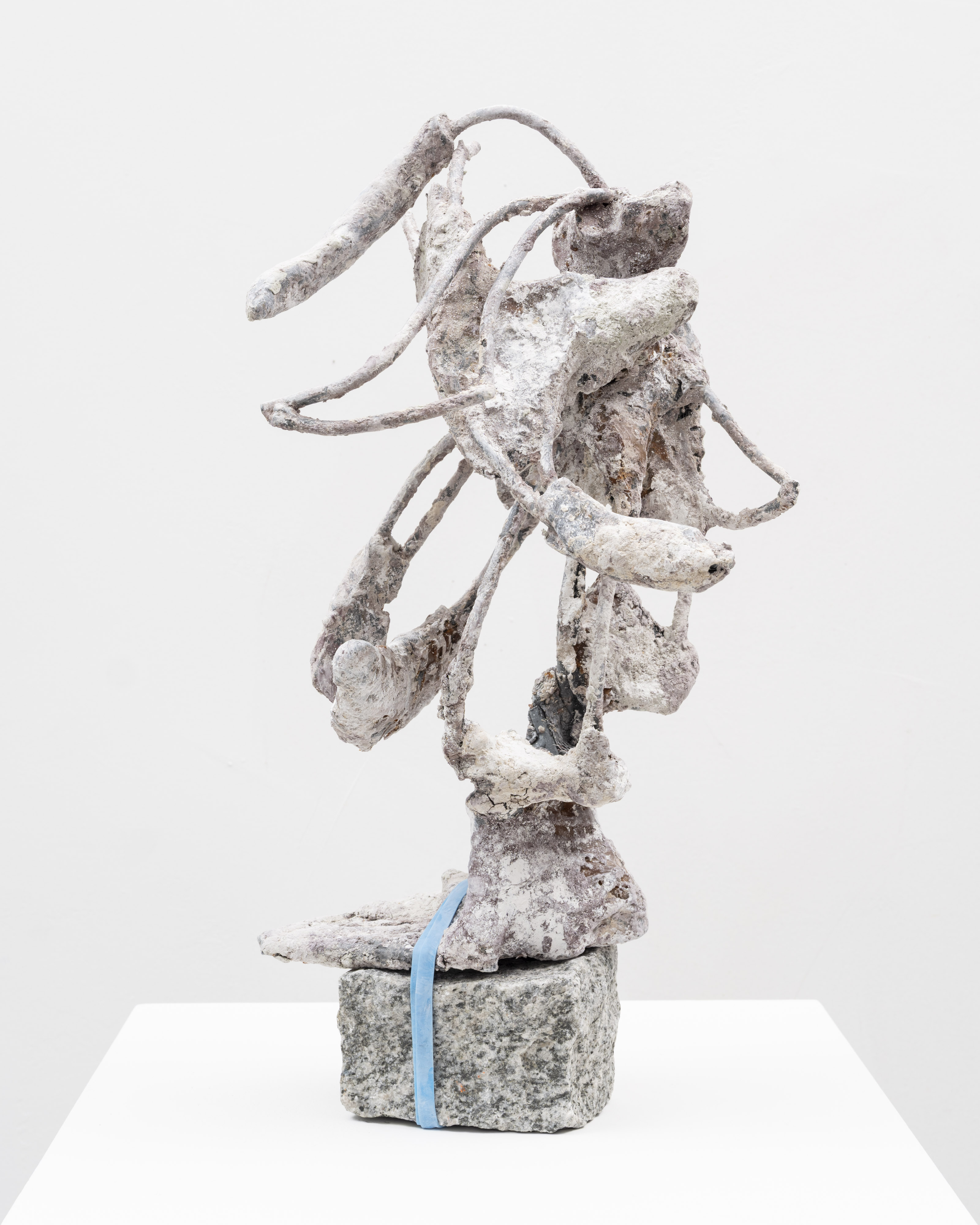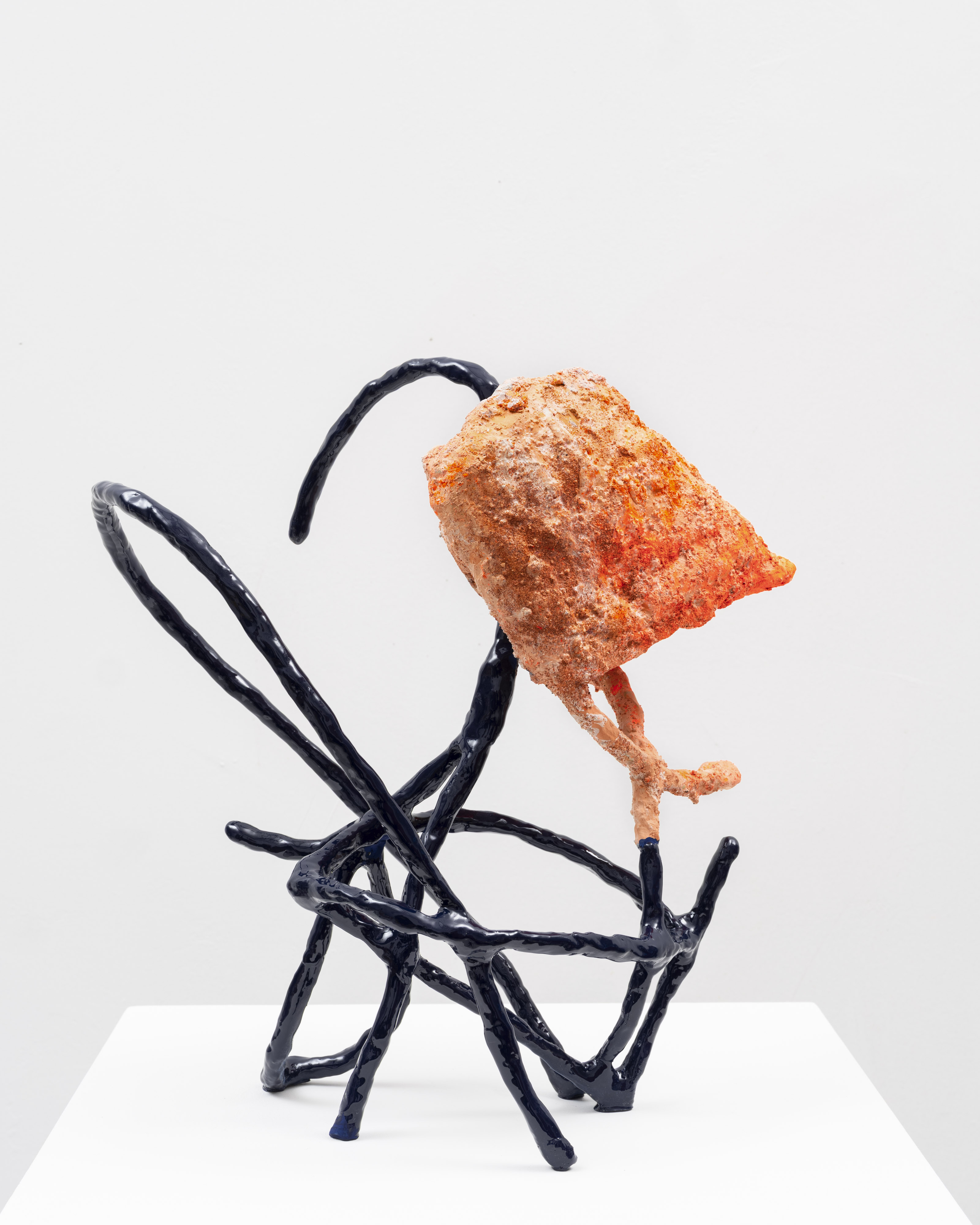 The surfaces of her works are subjected to a wide range of treatments, from 17th-century faux-marble plaster and lime-based techniques to automotive spray paint, oxidising rust finishes and bronze casting. Applied to her contorted structures, these processes generate contradictory visual logics—materials appearing to convulse, soften or calcify in unexpected ways. While her works may initially evoke associations with weathered artefacts, complex machinery or geological formations, such readings dissolve upon closer inspection. Instead, the sculptures invite a visceral encounter grounded in material presence and sensory experience.