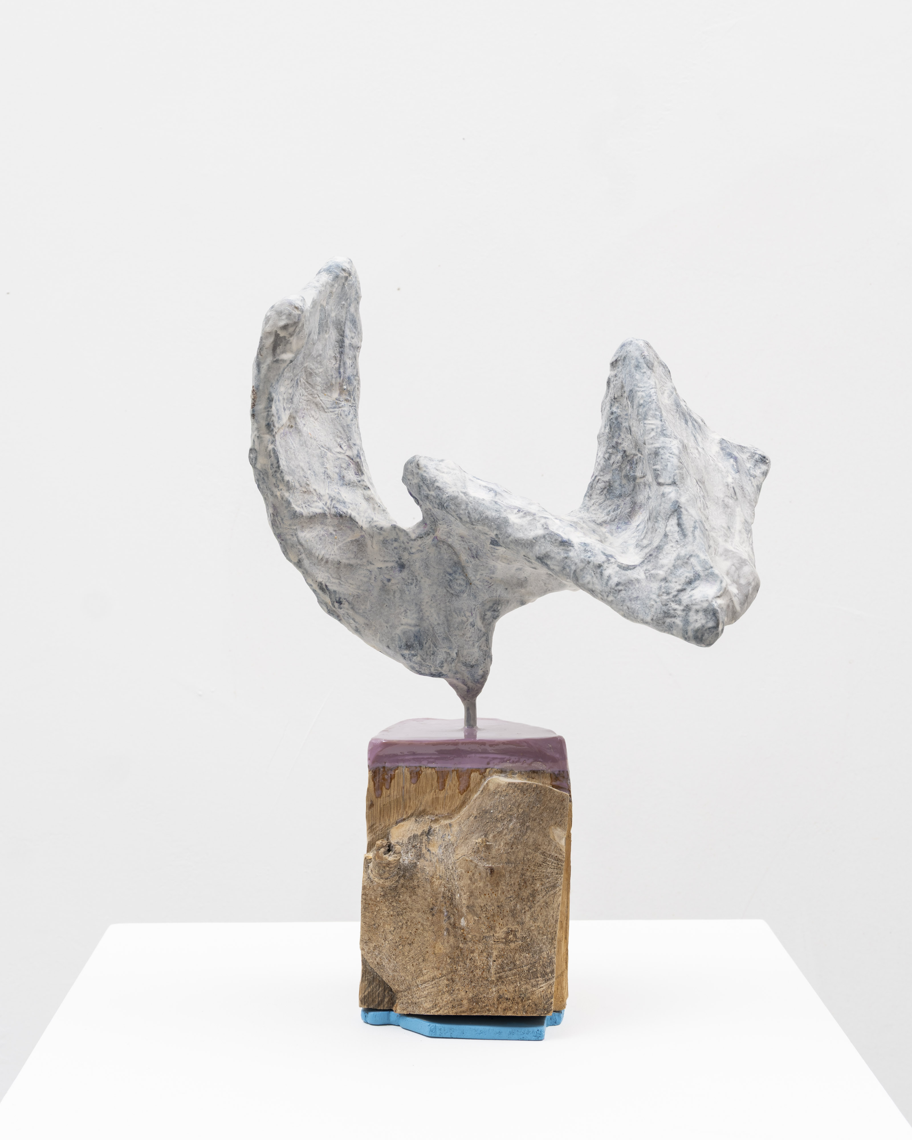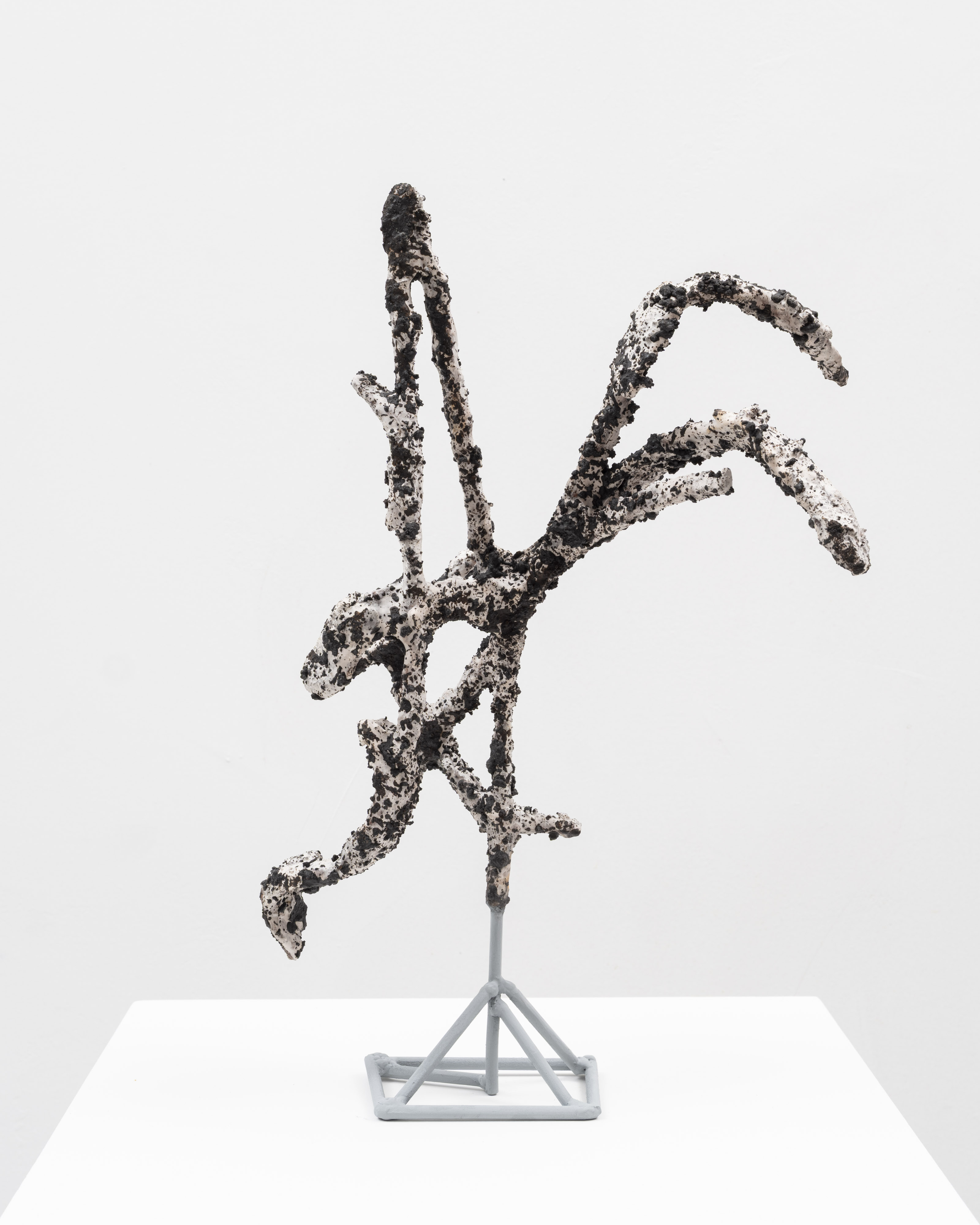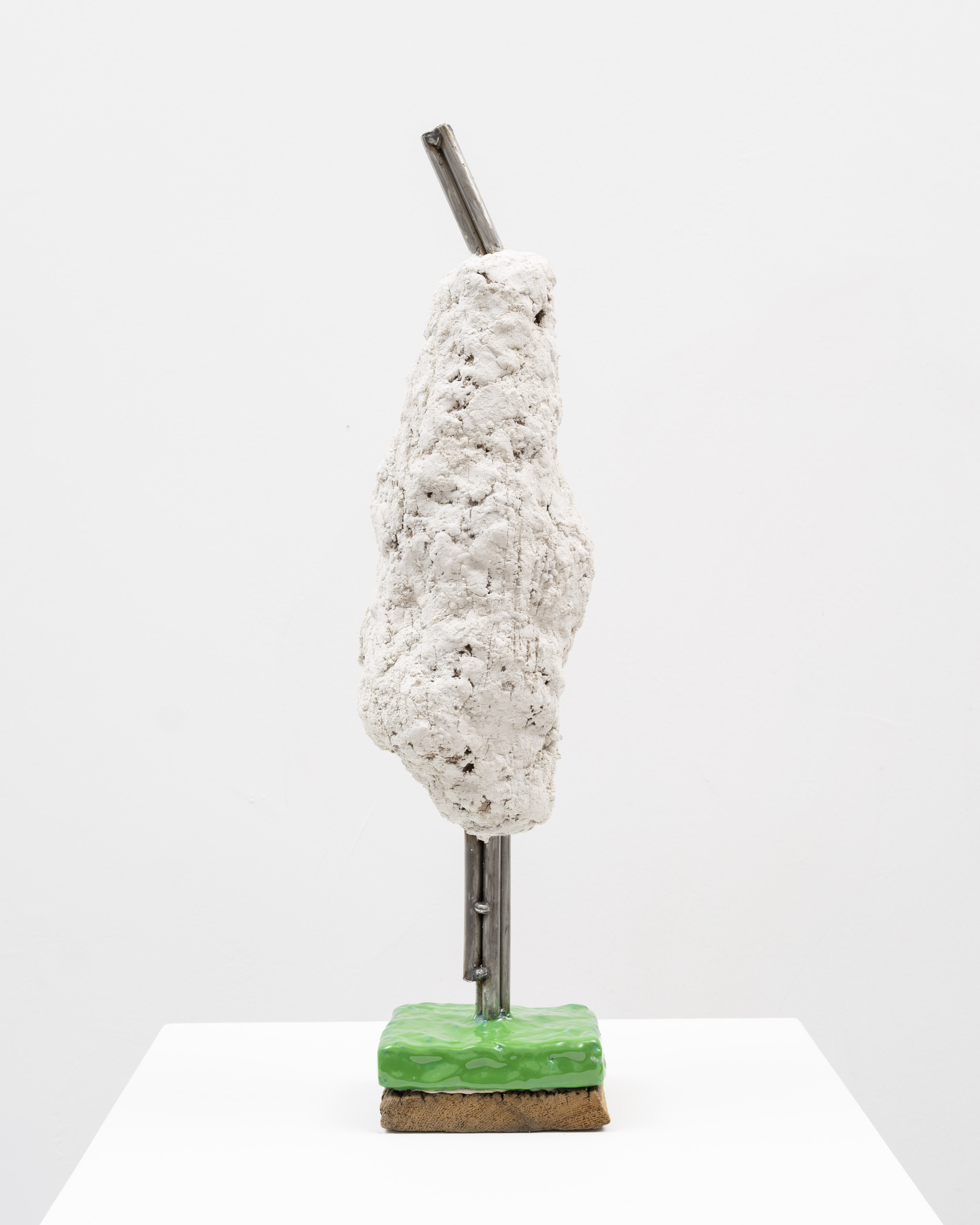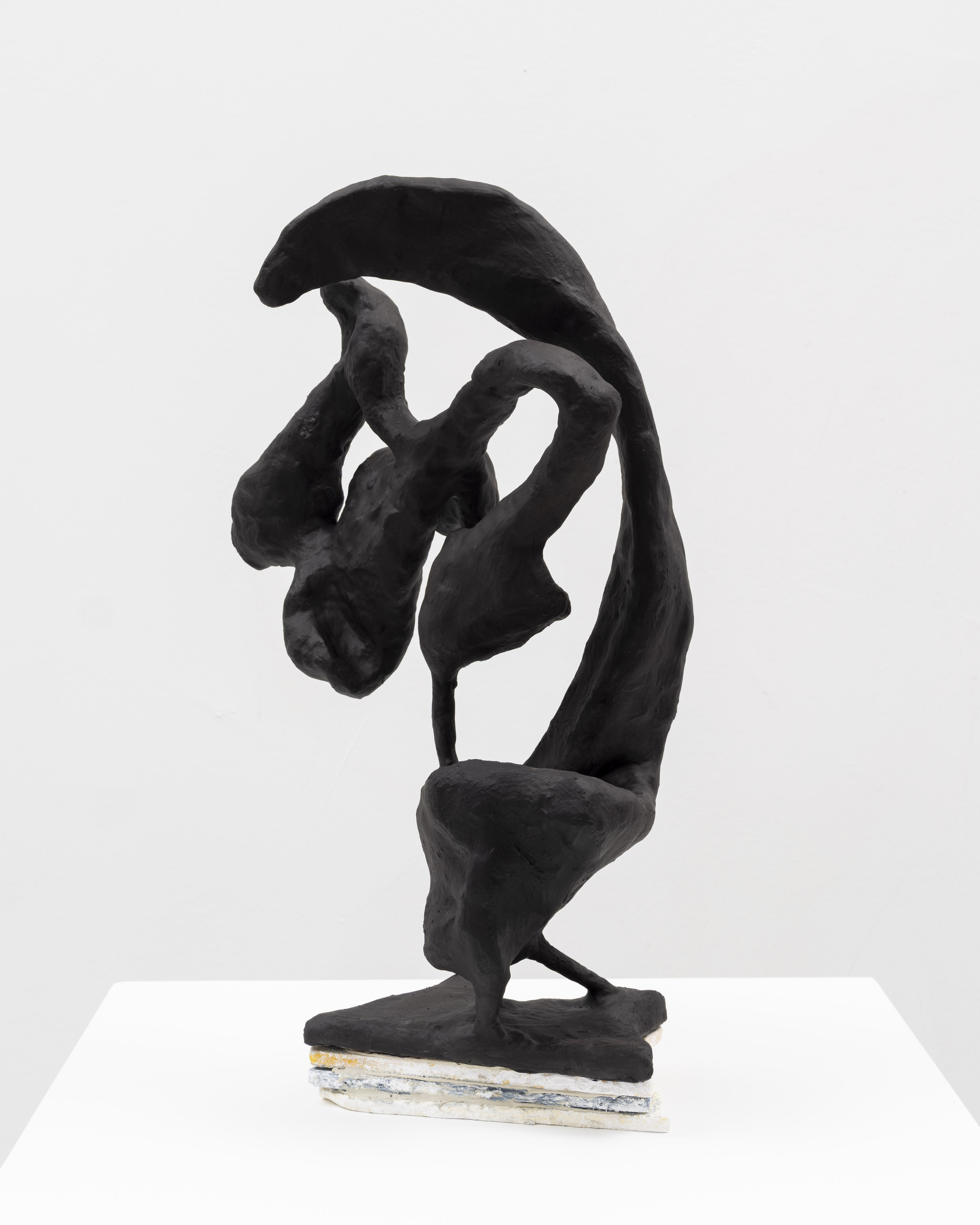 The surfaces of her works are subjected to a wide range of treatments, from 17th-century faux-marble plaster and lime-based techniques to automotive spray paint, oxidising rust finishes and bronze casting. Applied to her contorted structures, these processes generate contradictory visual logics—materials appearing to convulse, soften or calcify in unexpected ways. While her works may initially evoke associations with weathered artefacts, complex machinery or geological formations, such readings dissolve upon closer inspection. Instead, the sculptures invite a visceral encounter grounded in material presence and sensory experience.
