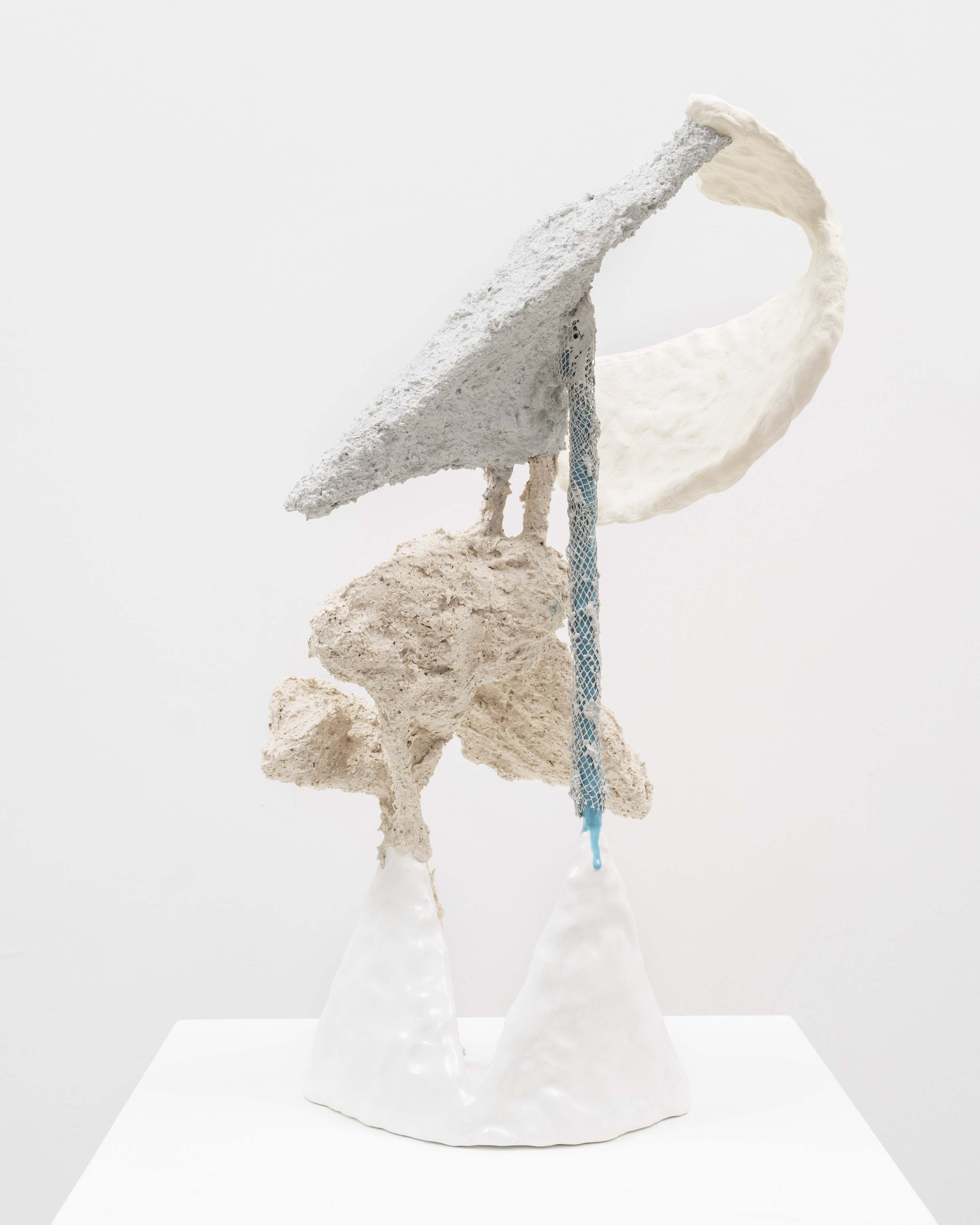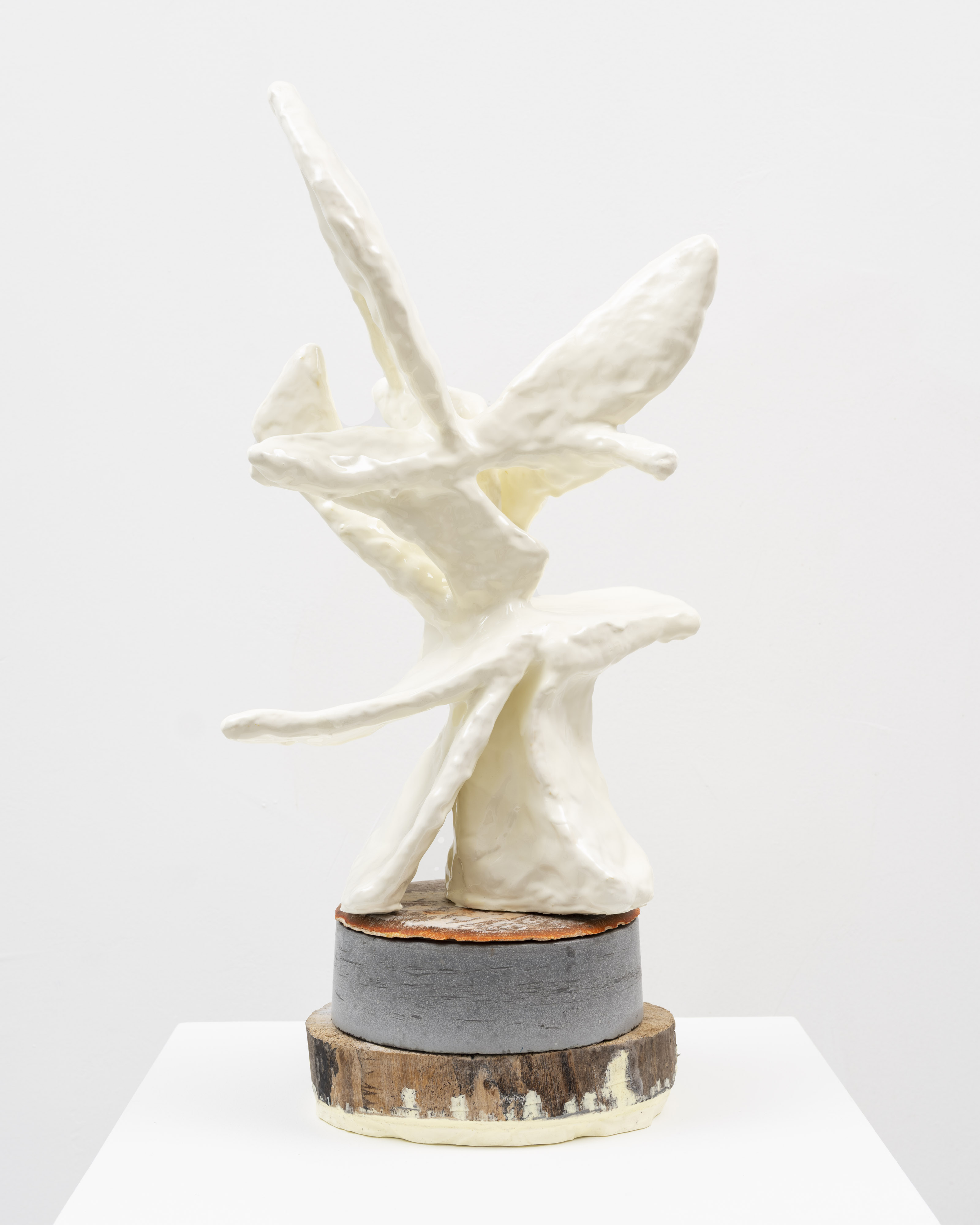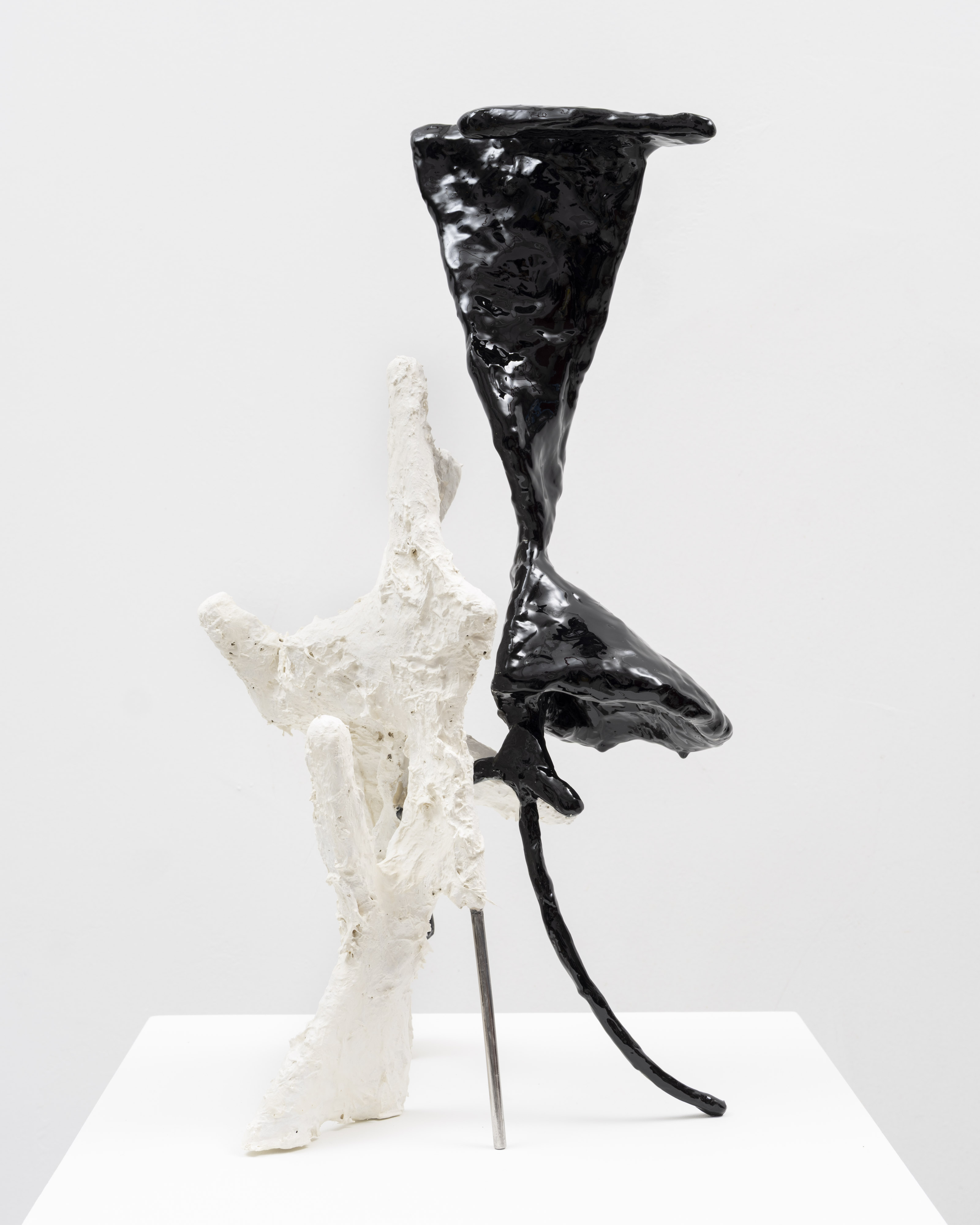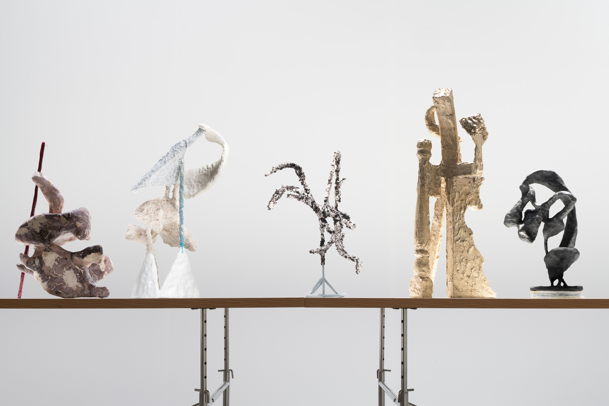 The surfaces of her works are subjected to a wide range of treatments, from 17th-century faux-marble plaster and lime-based techniques to automotive spray paint, oxidising rust finishes and bronze casting. Applied to her contorted structures, these processes generate contradictory visual logics—materials appearing to convulse, soften or calcify in unexpected ways. While her works may initially evoke associations with weathered artefacts, complex machinery or geological formations, such readings dissolve upon closer inspection. Instead, the sculptures invite a visceral encounter grounded in material presence and sensory experience.