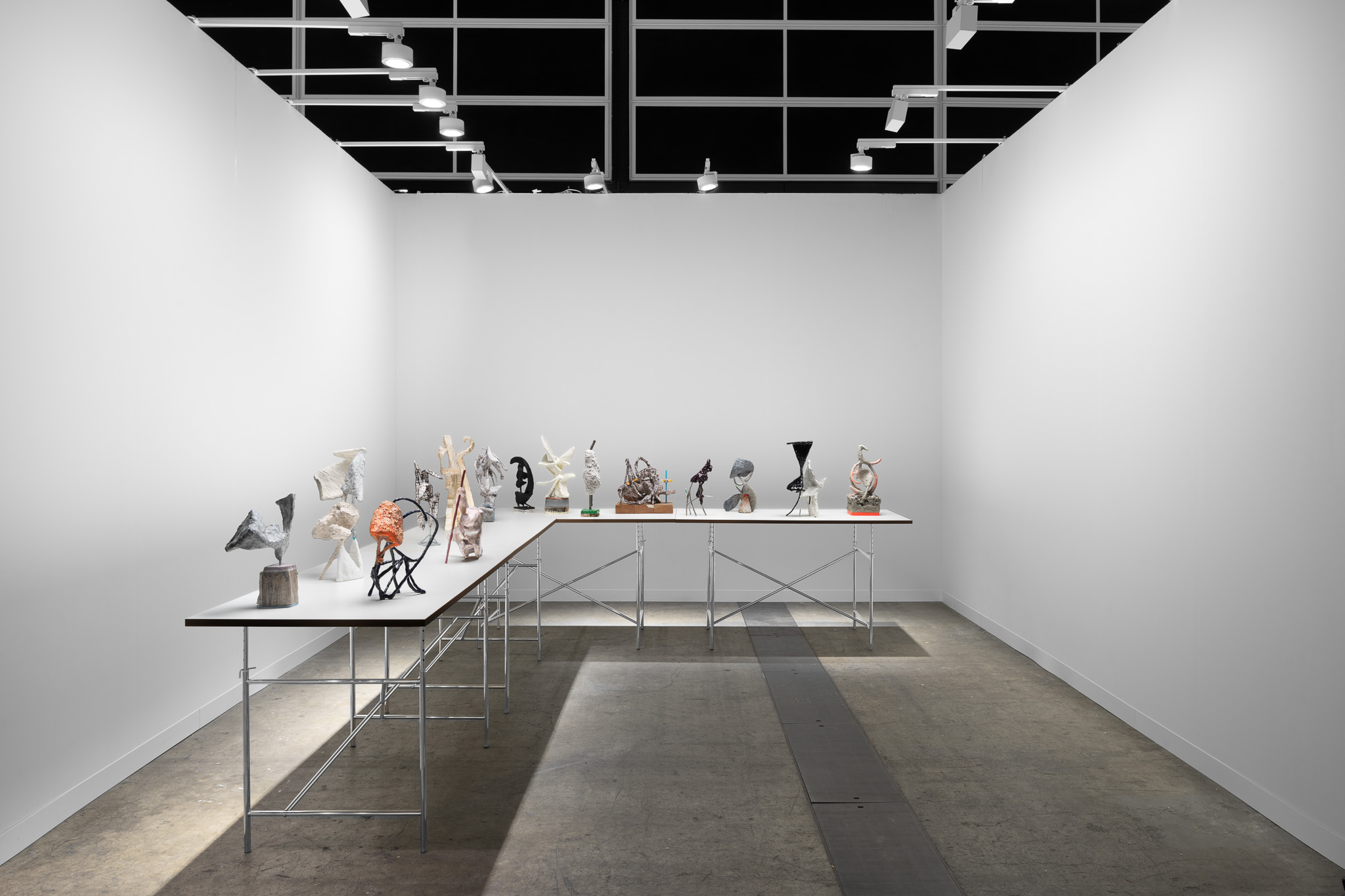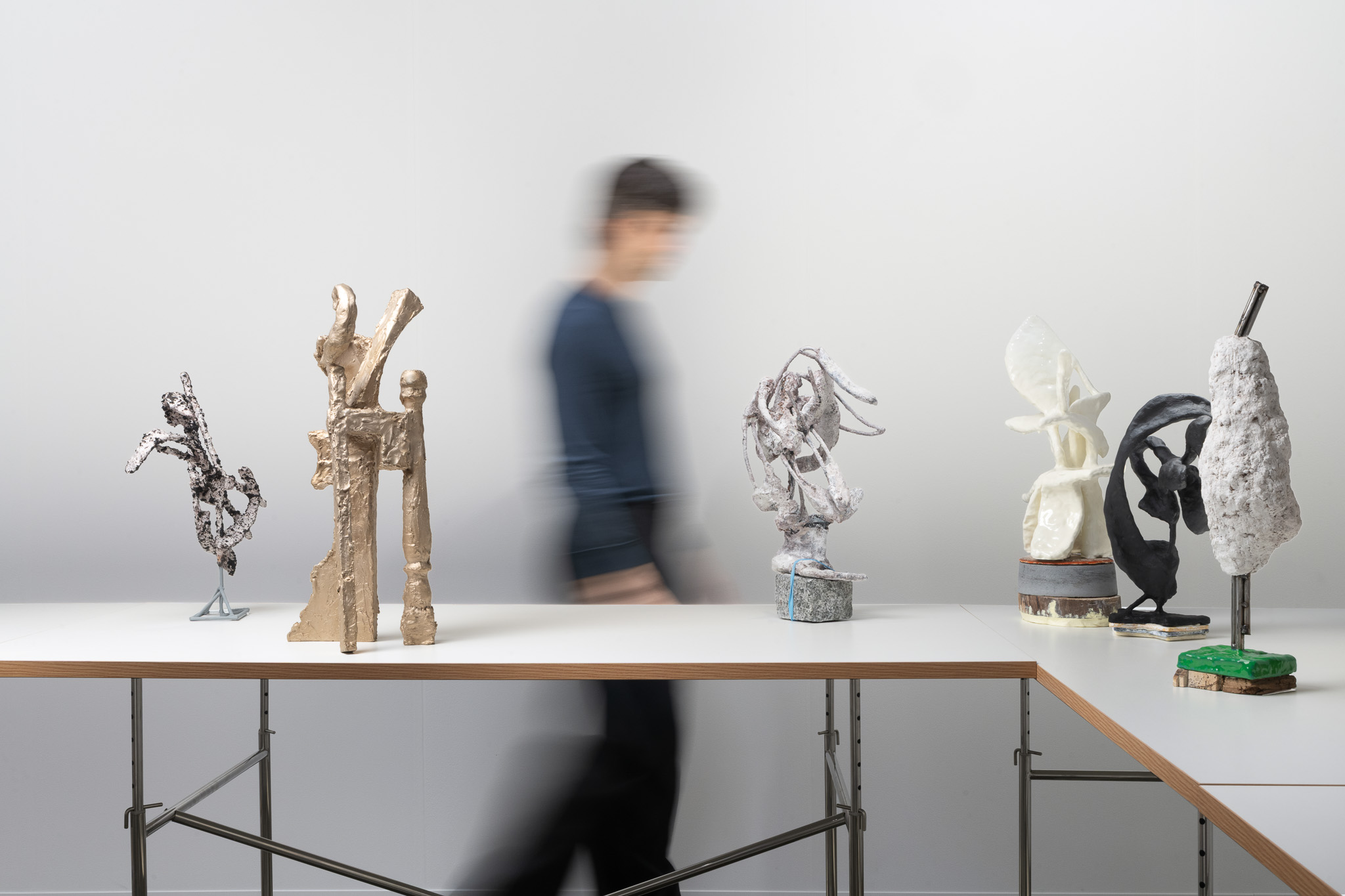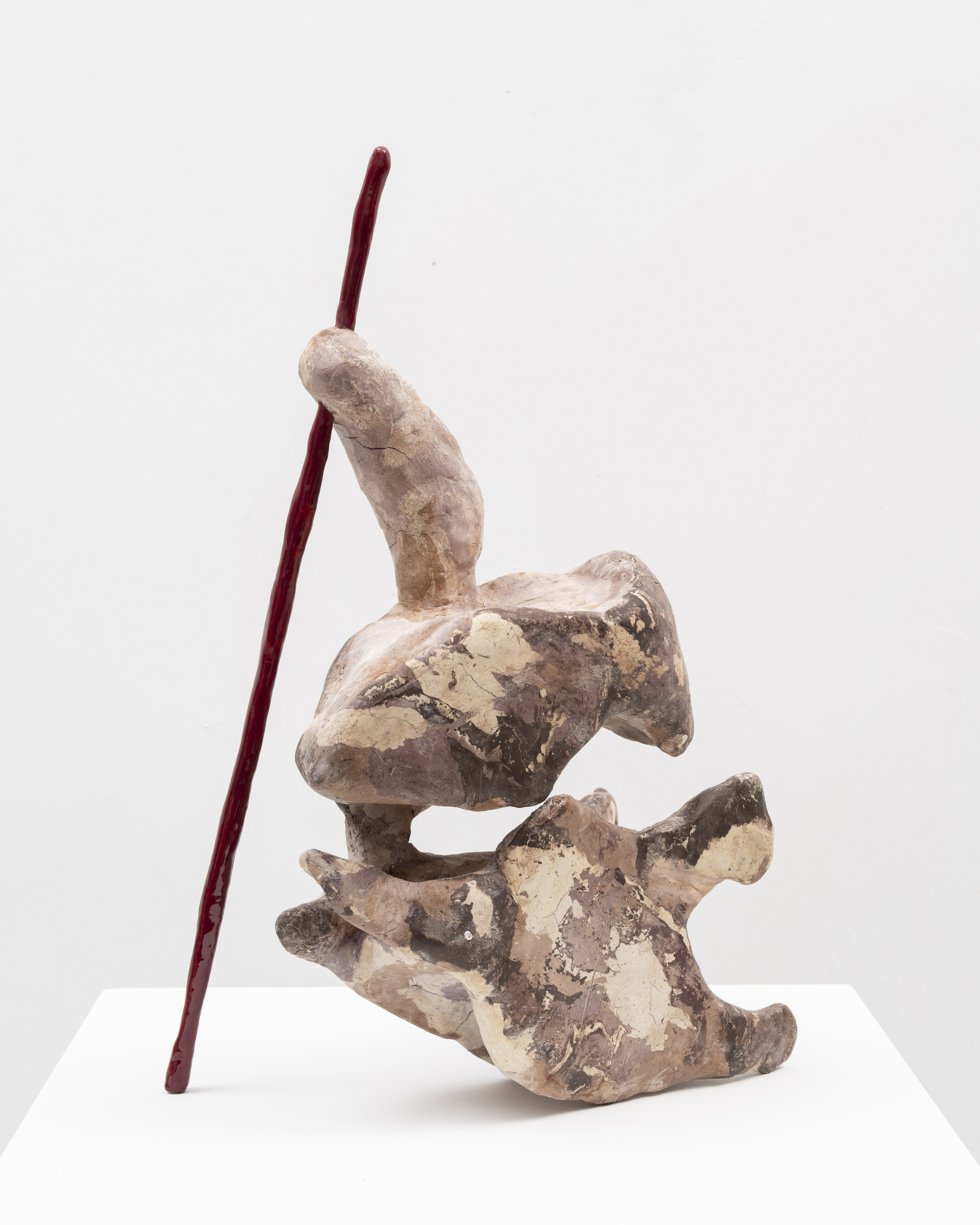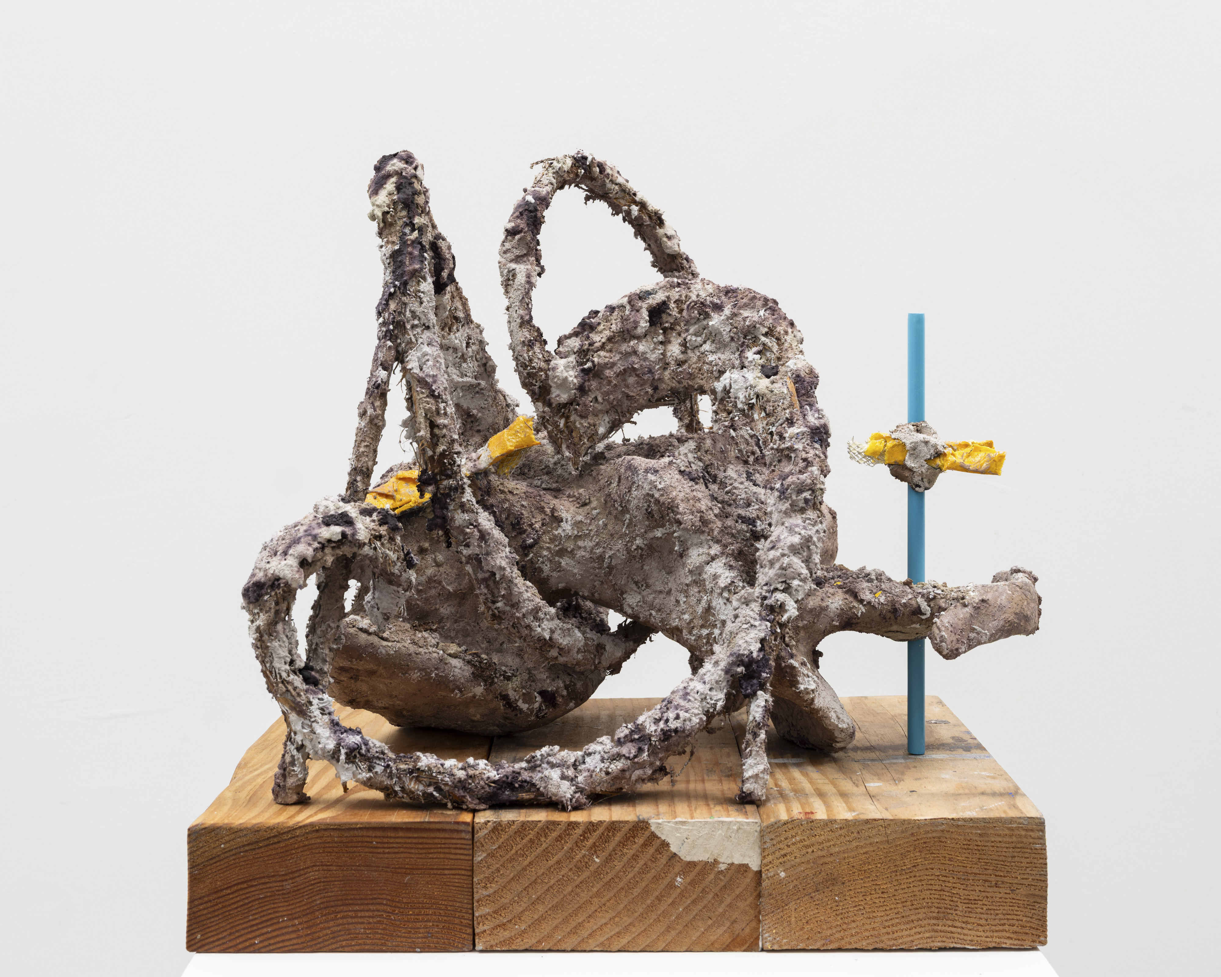 The surfaces of her works are subjected to a wide range of treatments, from 17th-century faux-marble plaster and lime-based techniques to automotive spray paint, oxidising rust finishes and bronze casting. Applied to her contorted structures, these processes generate contradictory visual logics—materials appearing to convulse, soften or calcify in unexpected ways. While her works may initially evoke associations with weathered artefacts, complex machinery or geological formations, such readings dissolve upon closer inspection. Instead, the sculptures invite a visceral encounter grounded in material presence and sensory experience.