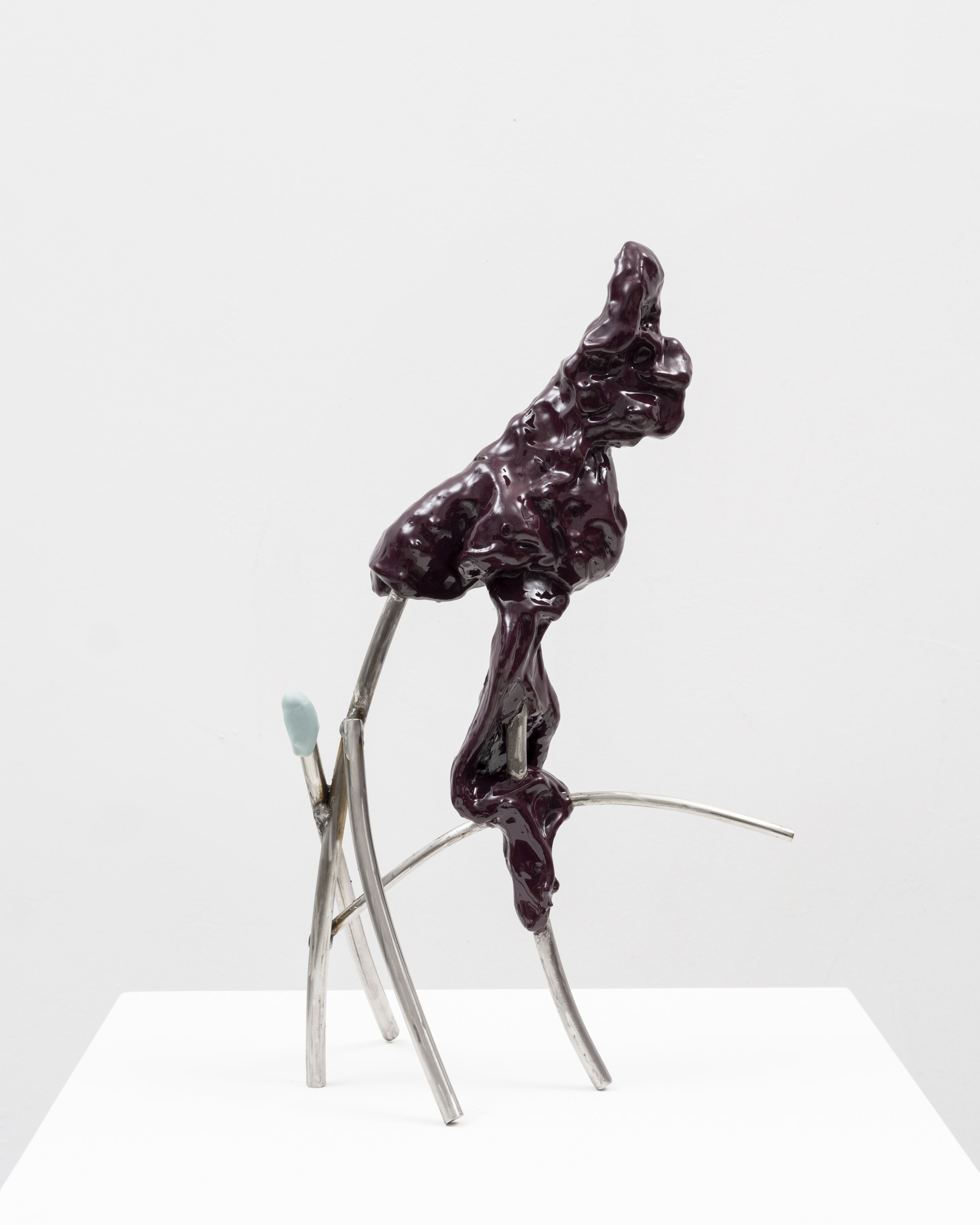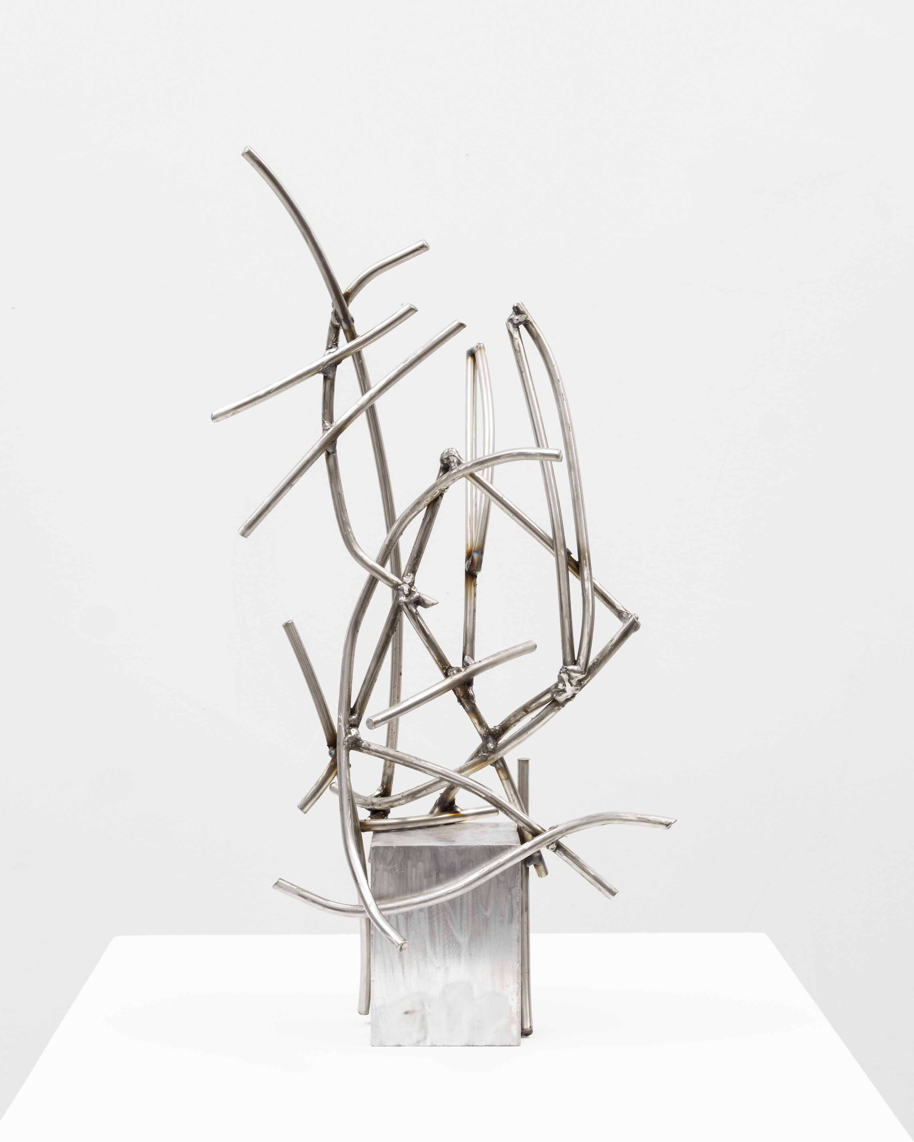 ‘Metropolitan’ (2026) compresses civic tension into a hollow resin body whose outward thrust is arrested by a baby-blue rubber band and a granite support—an engineered moment of vulnerability turned tactile. ‘Michelin E-Smoke’ (2026) freezes an exhaled plume into a curling, resilient form, translating atmospheric motion into architectural presence. ‘Gum Rod’ (2026) juxtaposes a spidery stainless-steel lattice with a slumped mass of epoxy that reads like accreted detritus—an image of structure attempting to accommodate excess. ‘Morning Toast’ (2026) plays monumentality off improvisation: a lacquered butter-white form reminiscent of classical sculptural maquettes sits atop a stacked, heterogeneous plinth that subtly undermines its heroic posture. With ‘Metalworker’s Alphabetic’ (2026), Nordin reduces sculpture to its structural bones—welded rods configured as an exposed lattice that reads like an architectural blueprint.